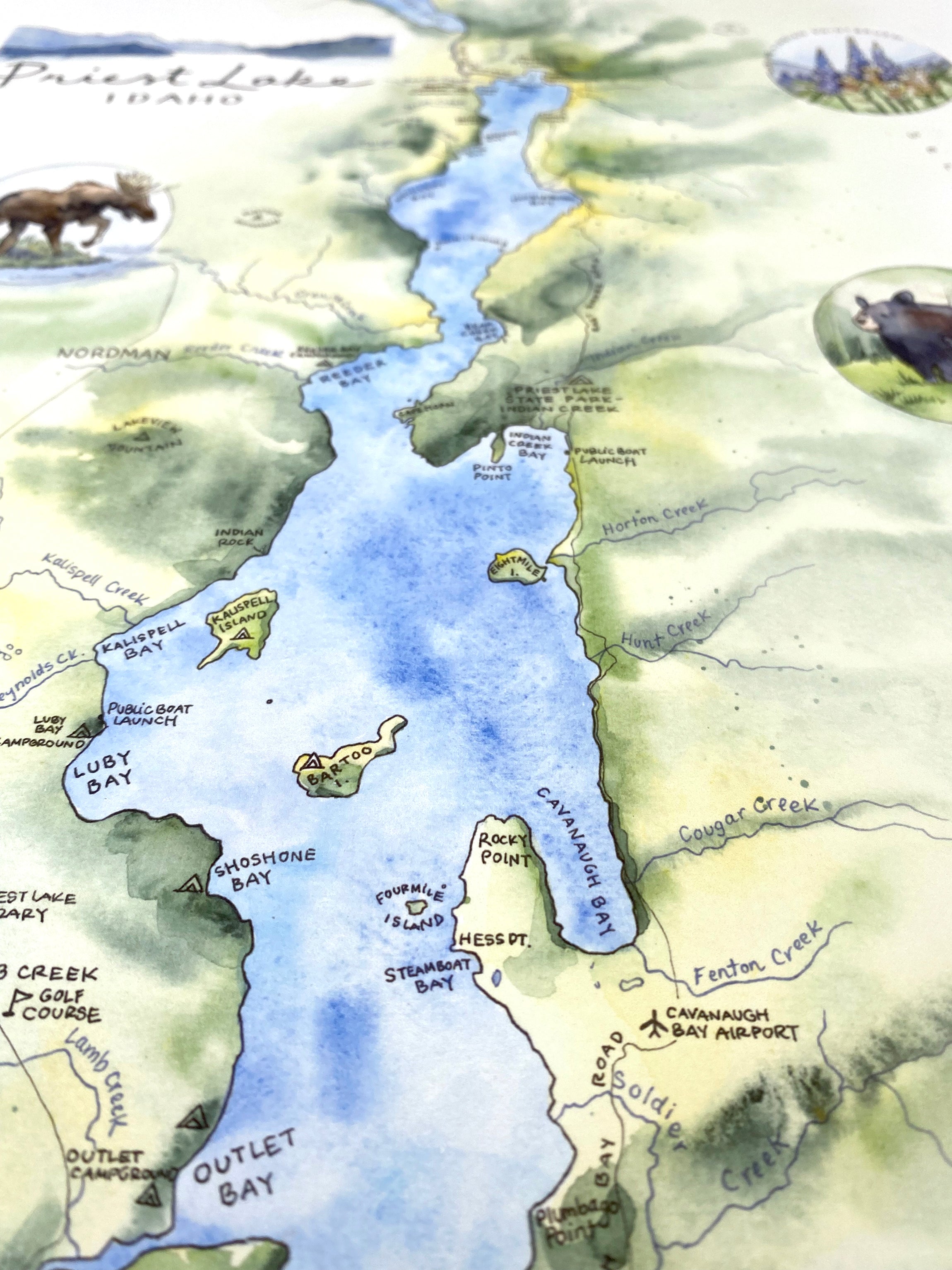 Priest Lake, Idaho Watercolor Map Art Print – Elizabeth Person Art